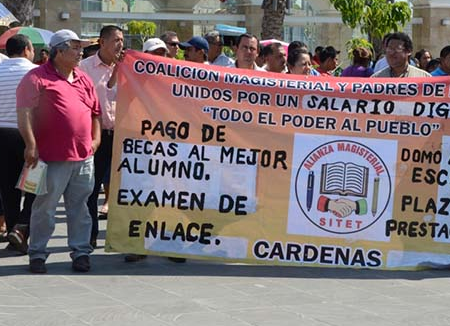 Ayer en un mitin organizaron en plaza de armas, maestros de municipios como Tacotalpa, Teapa, Jalapa, Nacajuca, Centla, Huimanguillo, Cárdenas, Comalcalco y Cunduacán, expusieron todas sus demandas, exigiendo al Gobierno del Estado el cumplimiento de las mismas.