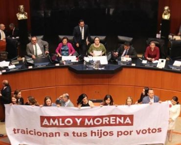 Y es que momentos antes de que el Pleno de la cámara de Senadores sometiera a votación la Ley General de Educación, los Senadores panistas sacaron una manta que decía “AMLO y Morena traicionan a tus hijos por votos”.
