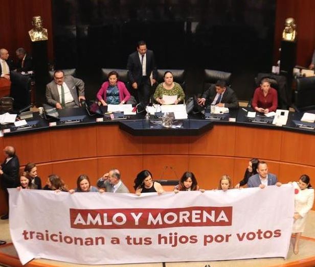 Y es que momentos antes de que el Pleno de la cámara de Senadores sometiera a votación la Ley General de Educación, los Senadores panistas sacaron una manta que decía “AMLO y Morena traicionan a tus hijos por votos”.