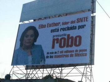 En uno de los espectaculares se puede ver el rostro de Gordillo Morales, con la leyenda: “Elba Esther, líder del SNTE, está recluida por presunto robo de más de 2 mil millones de pesos de los maestros de México”.