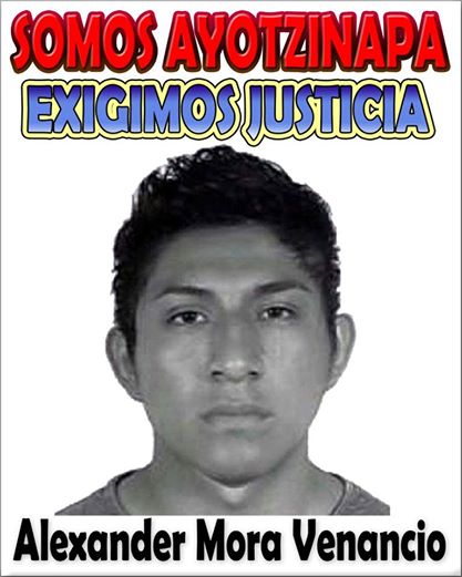 “Compañeros a todos los que nos han apoyado soy ALEXANDER MORA VENANCIO. A través de esta voz les hablo soy uno de los 43 caídos del día 26 de Septiembre en manos del narcogobierno. Hoy 6 de diciembre le confirmaron los peritos Argentinos a mi padre que uno de los fragmentos de mis huesos encontrados me corresponden. Me siento orgulloso de ustedes que han levantado mi voz, el coraje y mi espíritu libertario. No dejen a mi padre sólo con mi pesar, para él significo prácticamente todo, la esperanza, el orgullo, su esfuerzo, su trabajo y su dignidad. Te invito que redobles tu lucha. Que mi muerte no sea en vano. Toma la mejor decisión pero no me olvides. Rectifica si es posible pero no perdones. Este es mi mensaje. Hermanos hasta la victoria”.