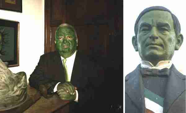 Es el escultor Cuauhtémoc Zamudio, que con ingeniosa protesta se pintó de verde porque hace unas semanas una estatua de Benito Juárez de la cual es autor, ubicada en el municipio de San Nicolás, Nuevo León, fue pintada de verde en un intento de restauración por parte del personal municipal de aquella demarcación.