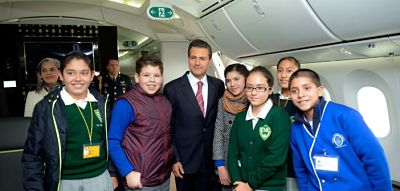 Para no dejar ninguna duda de que en el nuevo y flamante avión presidencial no hay lujos innecesarios ni tampoco es un palacete, el Presidente Enrique Peña Nieto abrió sus puertas (del avión claro está), a reporteros, a sus cercanos colaboradores y…¡a una docena de niños y niñas de los niveles de educación primaria y secundaria!