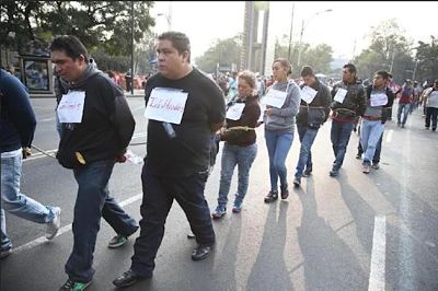 Durante la multitudinaria marcha realizada el día de hoy 6 de diciembre en apoyo a los padres de los normalistas desaparecidos de la Escuela Normal Isidro Burgos de Ayotzinapa, integrantes de la Coordinadora Nacional de Trabajadores de la Educación (CNTE) detectaron al menos 12 personas infiltradas entre su contingente.
