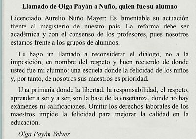 La mentora señala en la misiva que lamenta que su exalumno opte por la imposición y no permita que los maestros planteen modificaciones a mandatos de la Reforma Educativa.