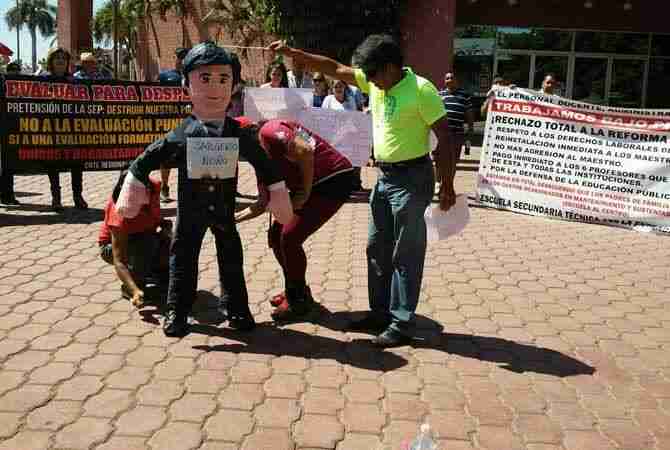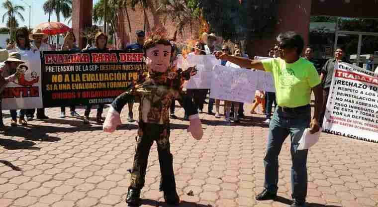 Guasave, Sinaloa.- Maestros de la Coordinadora Nacional de Trabajadores de la Educación (CNTE) protestaron contra la reforma educativa y, al termino de la manifestación, quemaron un monigote con la imagen del titular de la Secretaría de Educación Pública (SEP), Aurelio Nuño Mayer.