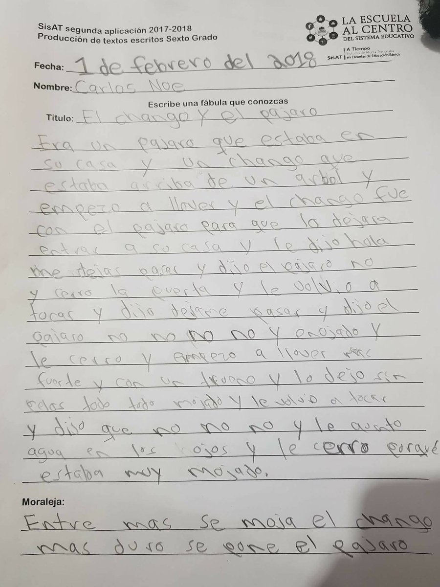 Un alumno de sexto grado llamado Carlos Noé, escribió una fábula titulada “El Chango y el pájaro” en la evaluación del Sistema de Alerta Temprana (SisAT), concretamente en la producción de textos escritos.