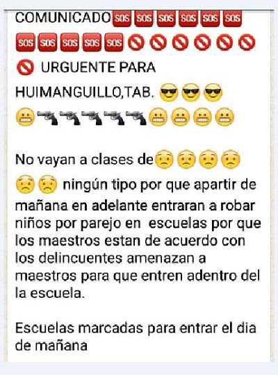 Asimismo, el mensaje enlista una serie de escuelas que serían blanco para la sustracción de infantes, tales como la escuela Secundaria “Prof. Ramón Mendoza Herrera” de Villa Estación Chontalpa, la escuela “Lic. Aureliano Colorado Calles, de Huimanguillo, entre otras.