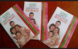 ¿Sabes cómo te benefician las reformas?, es el título del folleto, que en cuyo contenido difunde las bondades de la Reforma Energética, la de Telecomunicaciones, la de Competencia Económica, la Reforma Hacendaria, la Nueva Ley de Amparo, la Política-Electoral, la de Transparencia y la Reforma Educativa.