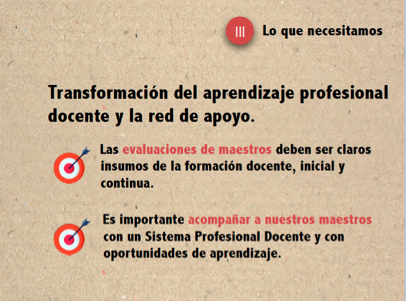 Las evaluaciones de maestros –y también PISA y todas las evaluaciones de logro de aprendizaje de los alumnos- deben ser claros insumos de la formación docente, inicial y continua. Tenemos concursos y evaluaciones de desempeño, pero todavía la calidad de los cursos y recursos para los maestros deja mucho qué desear. Tenemos que acompañar a nuestros maestros con un Sistema Profesional Docente que sea también, como dijimos de las evaluaciones de alumnos, diagnóstico con tutorías, incentivos, normales renovadas, oportunidades significativas y contextualizadas de aprendizaje continuo.
