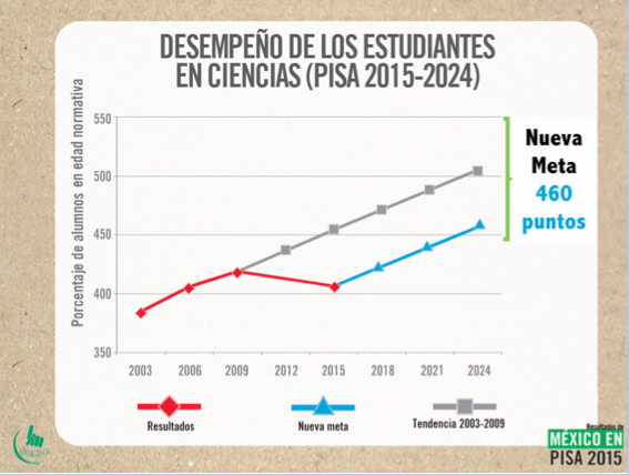 Con los datos revelados de PISA 2015, recalculamos una nueva meta para 2024: 460 de puntaje promedio para el dominio de matemáticas. Es el reto para que esta administración avance hasta los puntos intermedios que son necesarios. Ello incluye la incorporación de 88 % de la generación a la escolaridad en media superior.