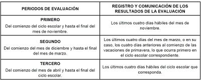 Asimismo plantea que la comunicación de resultados de evaluación de los alumnso a las familias se hará en tres periodos, como se indica en la siguiente tabla: