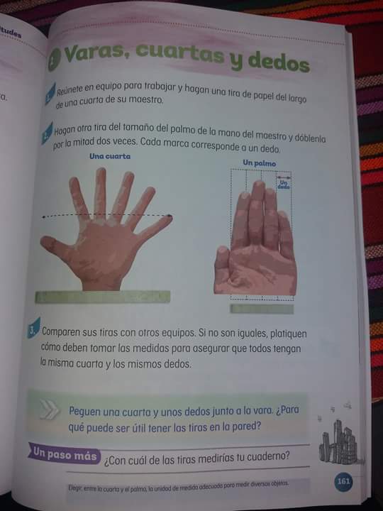 Y es que en el libro de matemáticas de segundo grado de primaria, página 161, hay unos problemas de estimación de medidas, en donde los alumnos tienen que medir una cuarta y el palmo de la mano de su maestro.